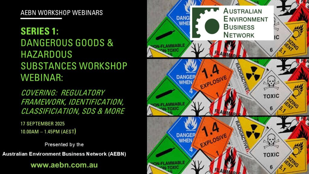 The Australian Environment Business Network (AEBN) has developed this interactive SERIES 1: Dangerous Goods, Hazardous Substances and GHS Workshop Webinar to bring you up to speed with the – Regulatory framework, Identification, Classification and Safety Data Sheets (SDS) of Dangerous Goods, Hazardous Substances/Chemicals and Globally Harmonised System for the Classification and Labelling of Chemicals (GHS), including recent regulatory changes to assist you and your organisation to remain compliant. The Workshop Webinar will include discussion regarding the new Australian Code for the Transport of Dangerous Goods by Road and Rail (ADG Code).